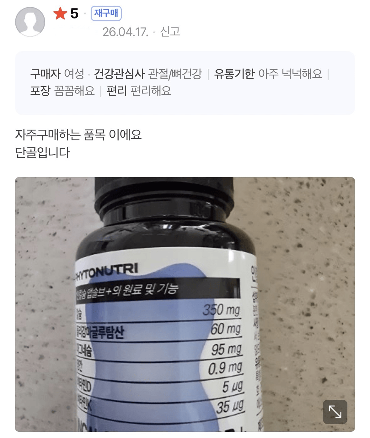 추가로 말씀하신 제품도 살펴봤는데, 언급하신 것처럼 어골칼슘을 기반으로 비타민D3, 비타민K2, 마그네슘, 망간, 폴리감마글루탐산이 포함되어 있네요.