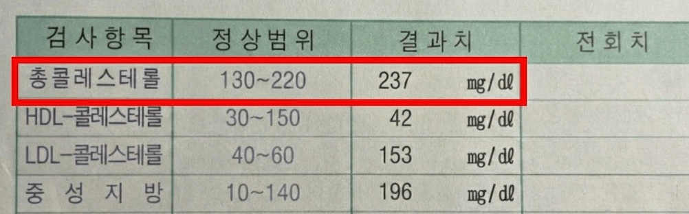 검사 결과를 보니 총콜레스테롤이 237mg/dL로 경계성 고콜레스테롤혈증에 해당됩니다.(정상 범위 200mg/dL 미만)