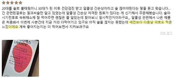 음주량 조절, 체중 관리, 정기적인 간 수치 확인 같은 기본적인 생활 습관 관리도 함께 병행하시면 좋습니다. 끝으로 제품 관련 세부 사항은 추가로 검색해보시거나 고객센터를 활용해보시는 것도 좋은 방법이니 참고하시기 바랍니다. 감사합니다.